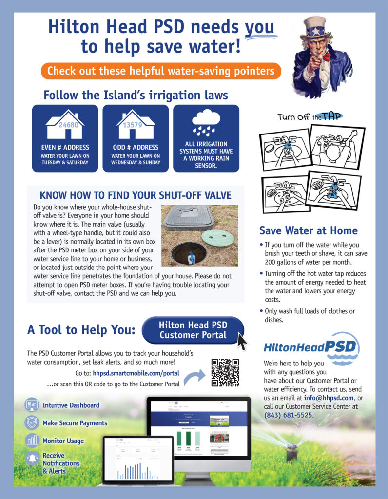 - Hilton Head PSD is here to help you with any questions or concerns you have about water efficiency. To contact us, simply send us an email at [email protected], or call our Customer Service Center at (843) 681-5525.