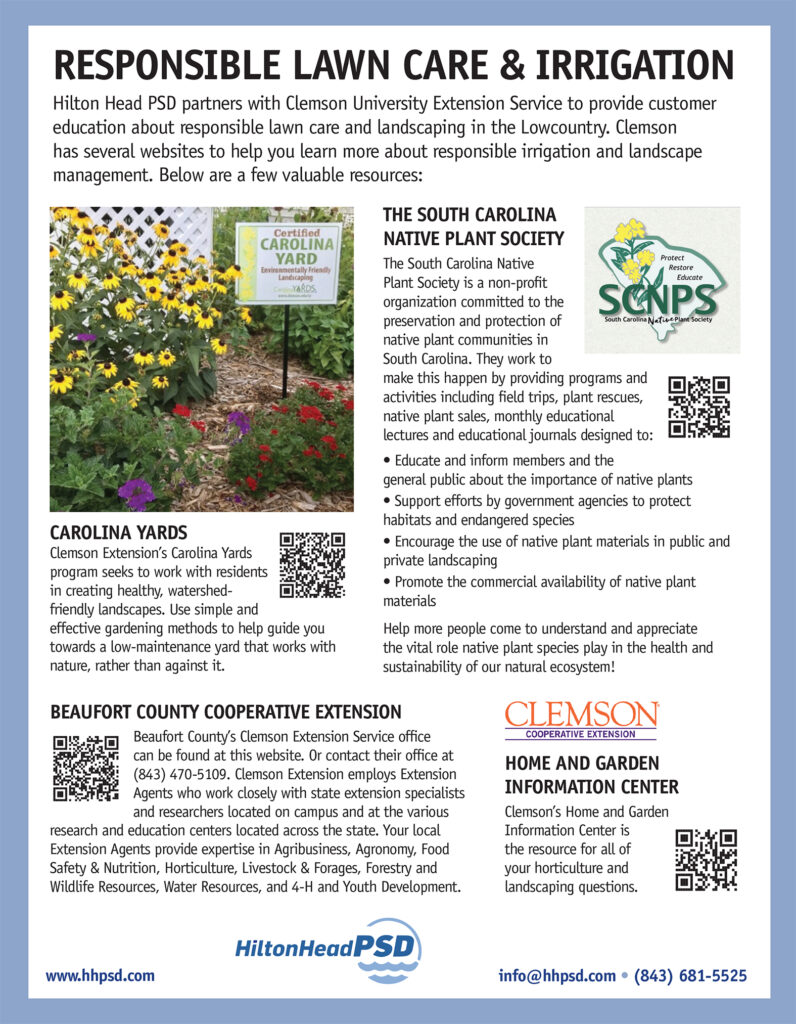 Hilton Head PSD believes it is each property owner’s duty to irrigate responsibly in order to conserve our greatest natural resource – water. The Town of Hilton Head Island has adopted both a rain sensor ordinance and a local irrigation ordinance, and the PSD strongly encourages property owners to adhere to these local laws.